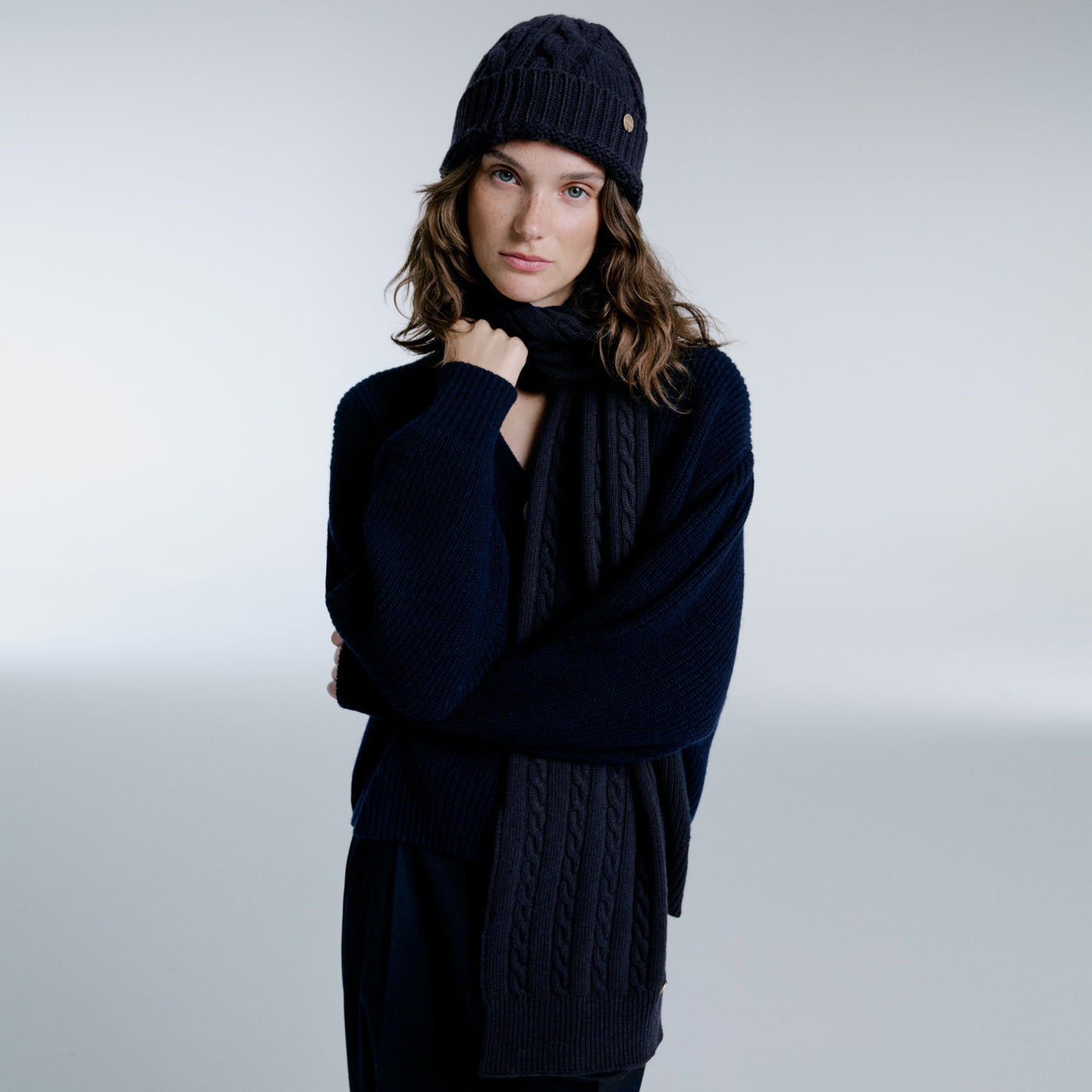 Fallon, crafted from a wool and cashmere blend, features a braided design for a refined and stylish look. Pairs beautifully with our Eleanor beanie for a complete winter set.