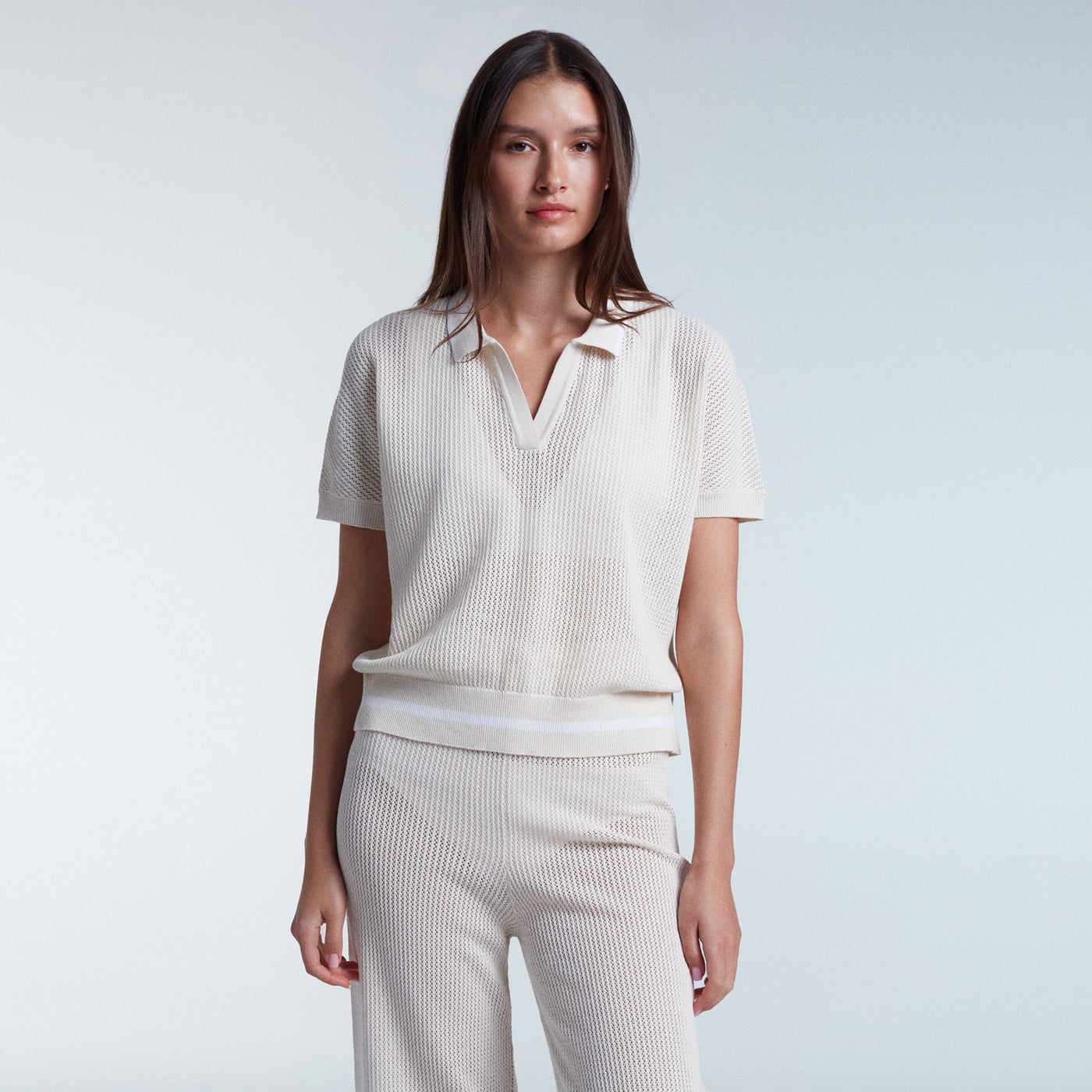 The Lenora Polo features a breathable, full open-knit design with a classic polo collar and ribbed details. Paired with the Nara open-knit trousers, this set creates a chic and relaxed beachside look. The polo is crafted from soft, breathable knit for all-day comfort and style.