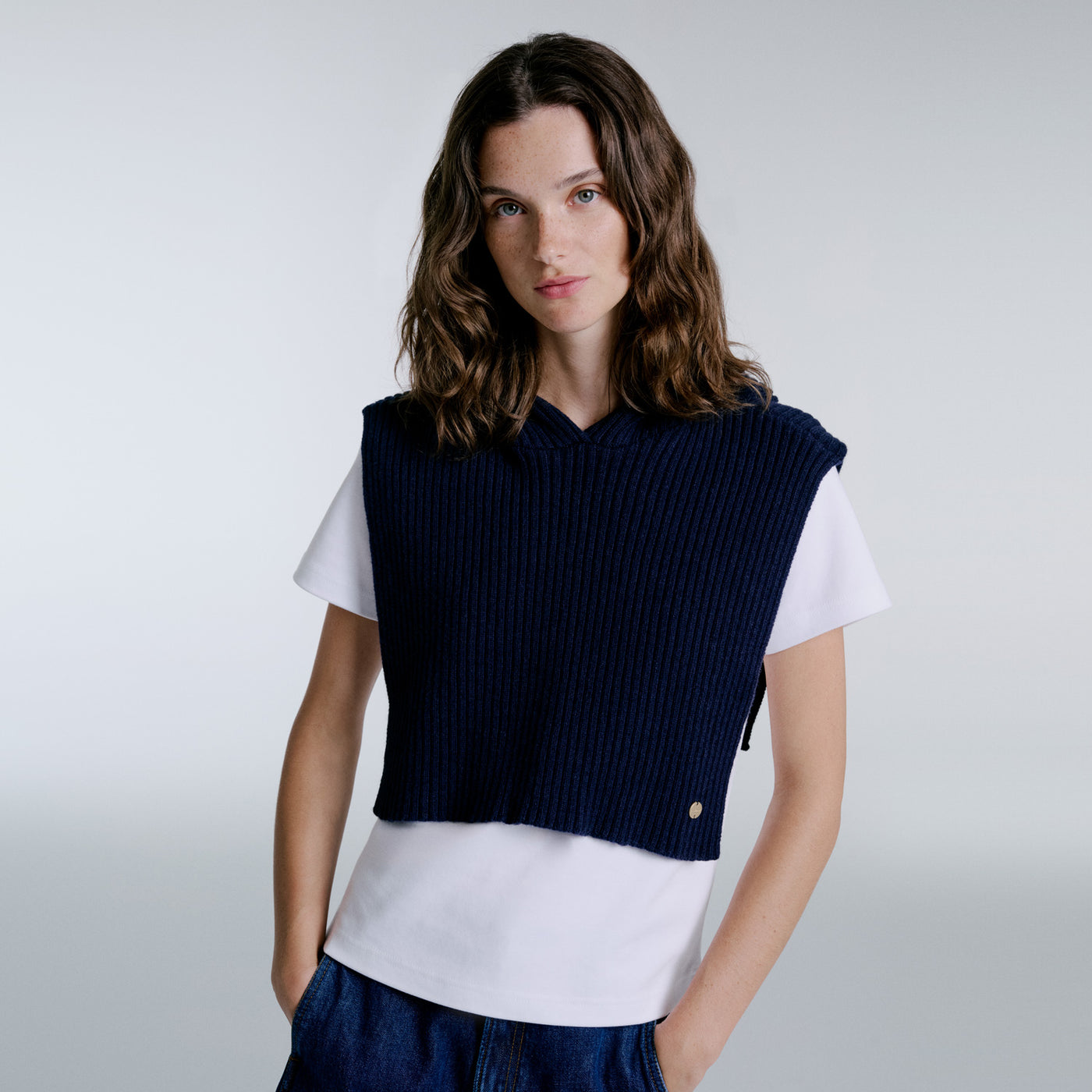 Patricia is a sleeveless wool vest designed to layer effortlessly over shirts and t-shirts. The hood adds a sporty touch, combining casual ease with refined style.