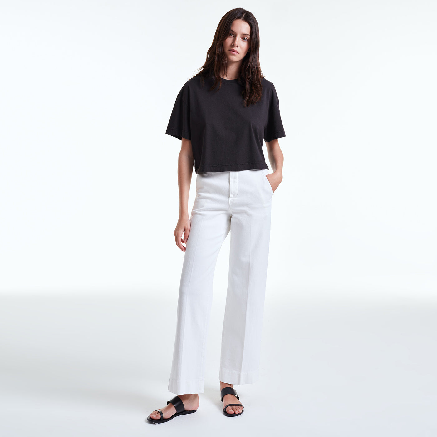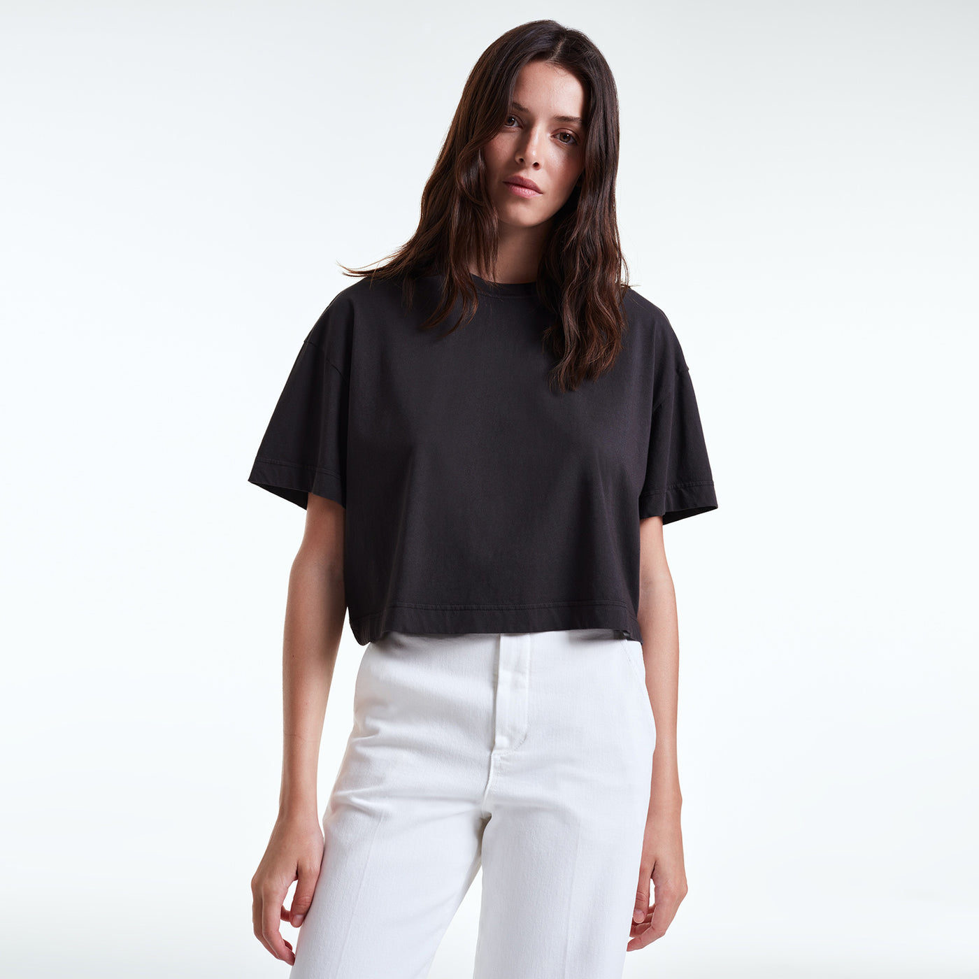 A high-quality oversized cotton t-shirt that stands out for its slightly cropped hem and dropped shoulders. It is perfect for everyday styling, you can easily throw it on with a colourful blazer on top and chucky accessories for a stylish look.